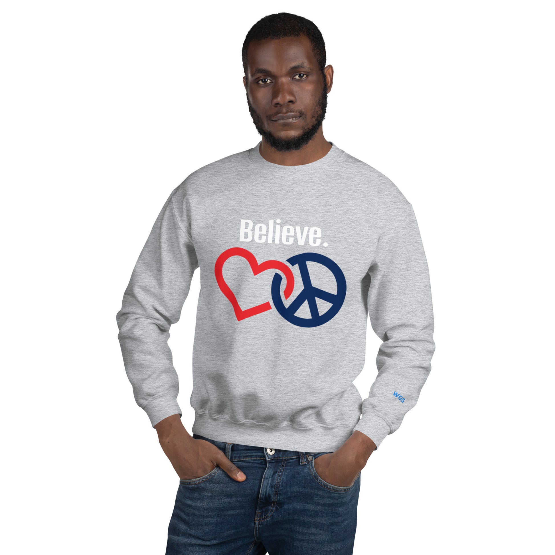 Let Love & Peace speak for itself with this warm, sporty graphic unisex sweatshirt. Featuring a pre-shrunk, classic fit made from air-jet spun yarn for a soft feel, this sweater is perfect for colder months. Love & Peace is a core value for Women Go Swish. • 50% cotton, 50% polyester • Pre-shrunk • Classic fit • 1x1 athletic rib knit collar with spandex • Air-jet spun yarn with a soft feel • Graphic Sweatshirt double-needle stitched collar, shoulders, armholes, cuffs, and hem
