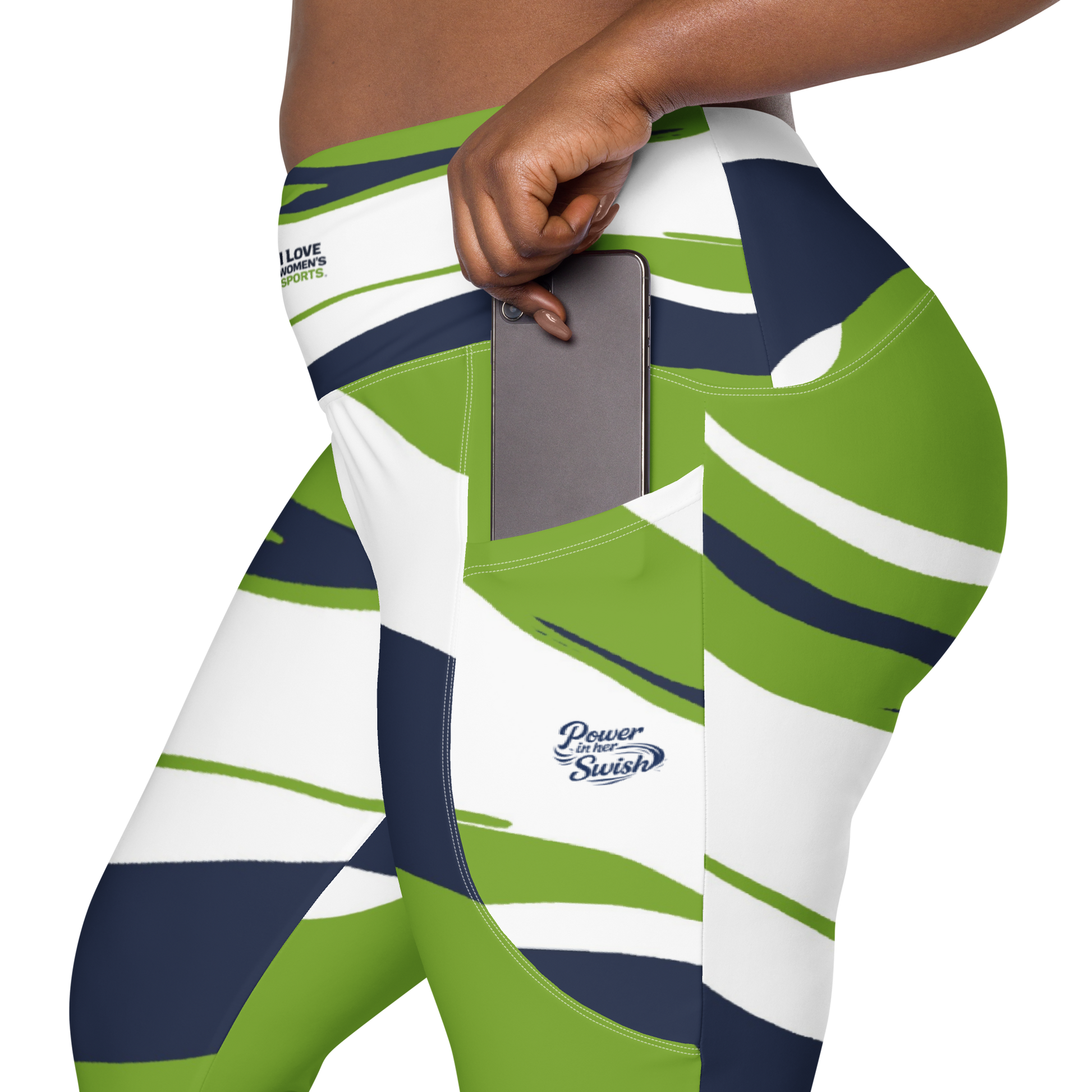 Celebrate your love for women's sports in the beautiful green, white, and blue "I Love Women's Sports" Leggings with pockets. Boasting a classic, high-waisted design and two convenient side pockets, these semi-compression leggings will support you during any activity. Made with 74% recycled polyester and 26% elastane• UPF 50+ for ultimate sun protection• Soft and stretchy fabric with a mild compression feel• Tight fit with a flattering cut• Features 1 pocket on each side and a triangle gusset for added functionality. Perfect for any active athletic woman! Pair with the matching I Love Women's Sports luxury V-neck Tee. Ready, set, swish! There is power in her Swish.